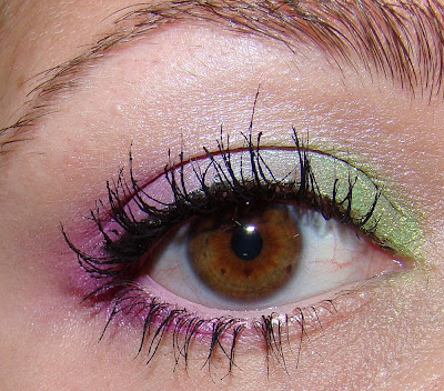 3-على الزاوية الخارجية للعين يتم وضع لون زهر غامق او فوشي فاتح لماع وسحبه الى الداخل ومزجه مع الفضي في الوسط وكذلك يرسم خطامنه تحت العين وسحبه مع الزهر الموجود على الطرف الخارجي للعين